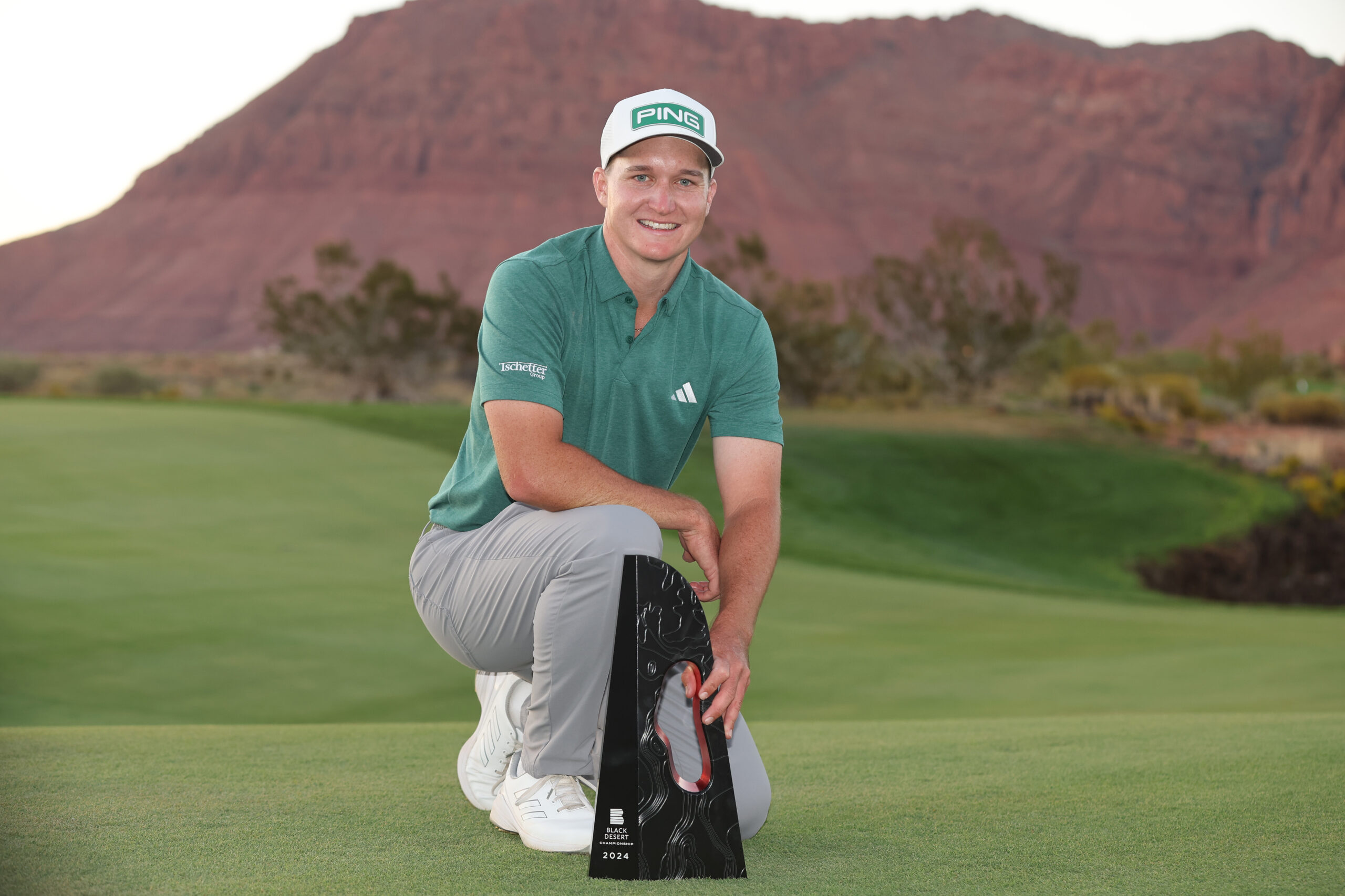 ST GEORGE, UTAH – OCTOBER 13: Matt McCarty of the United States poses with the trophy after winning the final round of the Black Desert Championship 2024 at Black Desert Resort on October 13, 2024 in St George, Utah. (Photo by Christian Petersen/Getty Images)